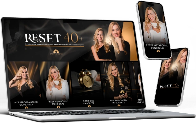Com o Reset 40+, você vai entender o que o seu corpo realmente precisa nesta fase da vida e como ativar um novo metabolismo, sem sofrimento e sem culpa.